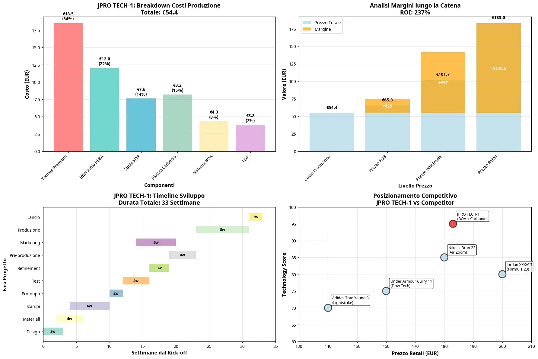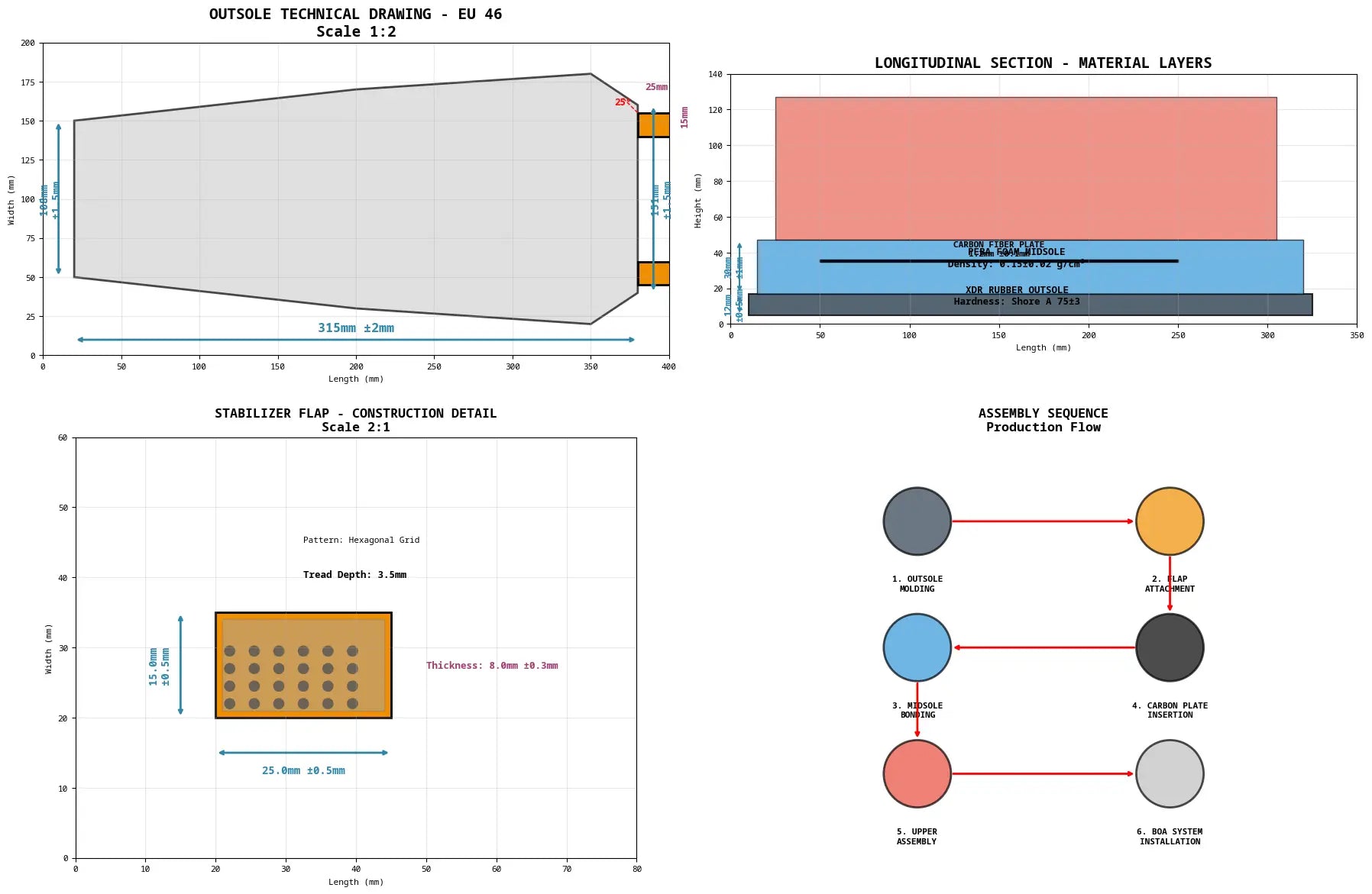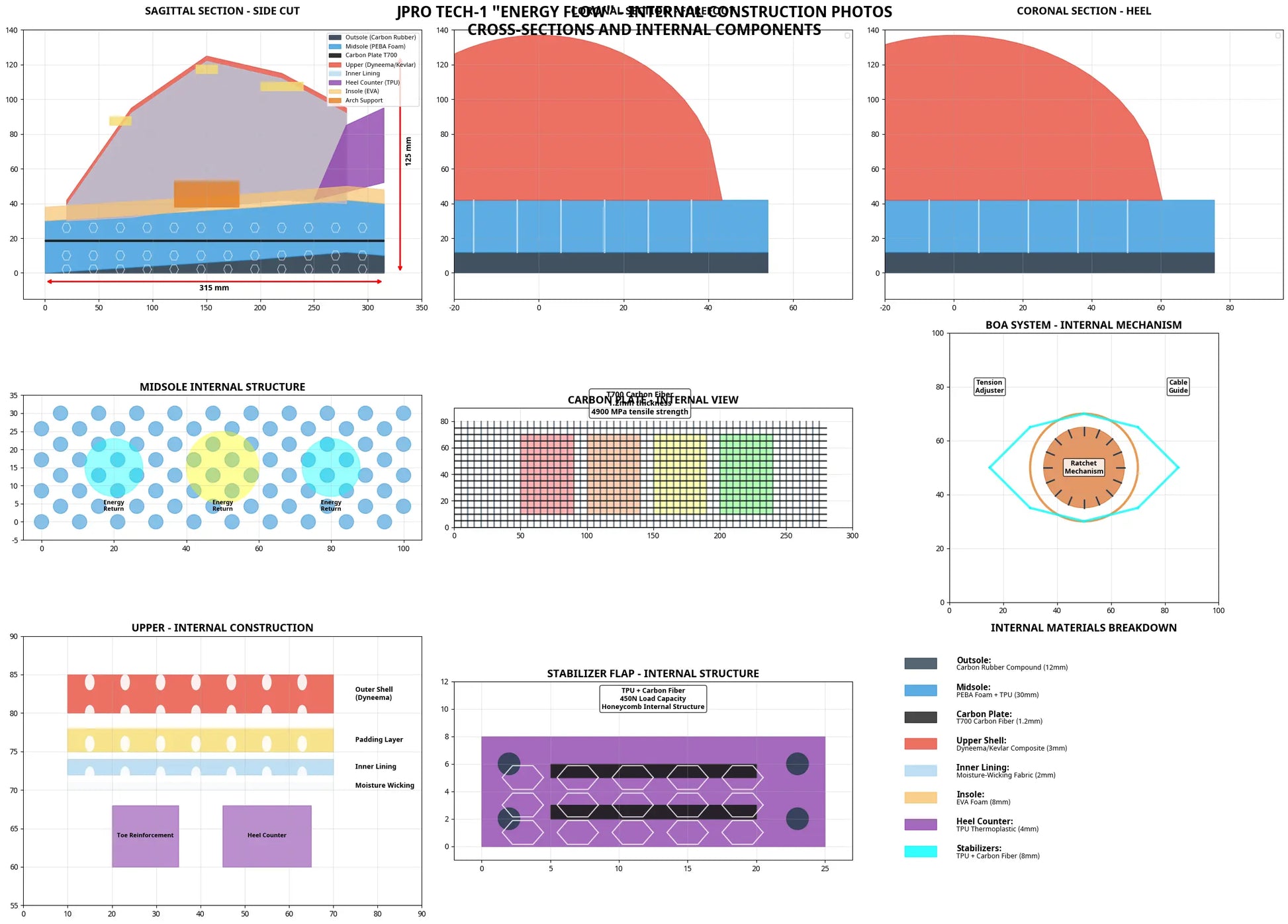 Ho creato disegni tecnici completi per la scarpa da basket JPRO TECH-1 basati sulla tua immagine di riferimento caricata e sul nostro precedente lavoro di sviluppo.
